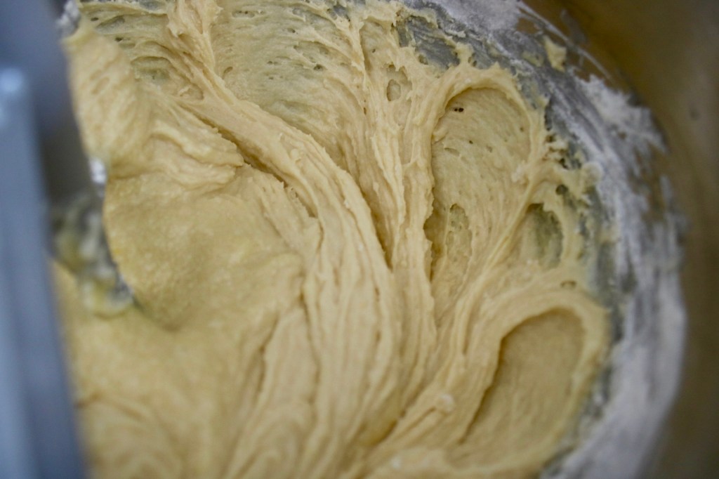 You can see the batter considering splitting after the eggs bomb it with more fat and moisture than it knows what to do with. Bring on the flour!