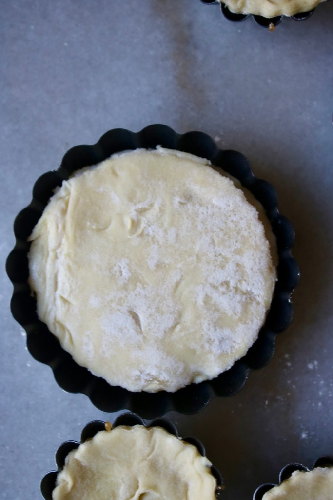 Usually watching professional bakery videos makes me drool because of all the equipment, and this one was no exception. I didn’t have the right size fluted tart molds, so I went pantry diving and decided to try my mini fluted tins and the short-walled ones with removable bases.