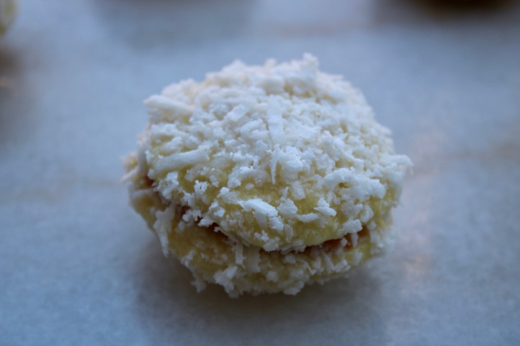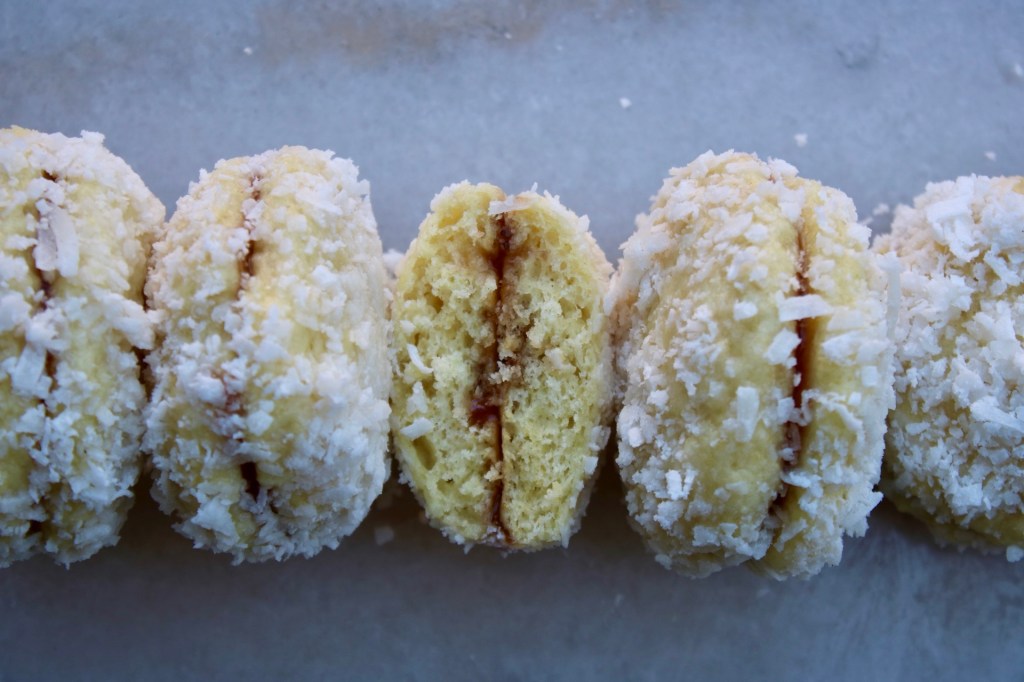These furry cuties are the size of cookies but the texture of a light scone. By itself, it’s a rather bland “biscuit”, until you glue two of them together with jam, dunk them in a thin icing and roll them in dried coconut. Seems like the baking equivalent of throwing on some glitter and a feather boa.