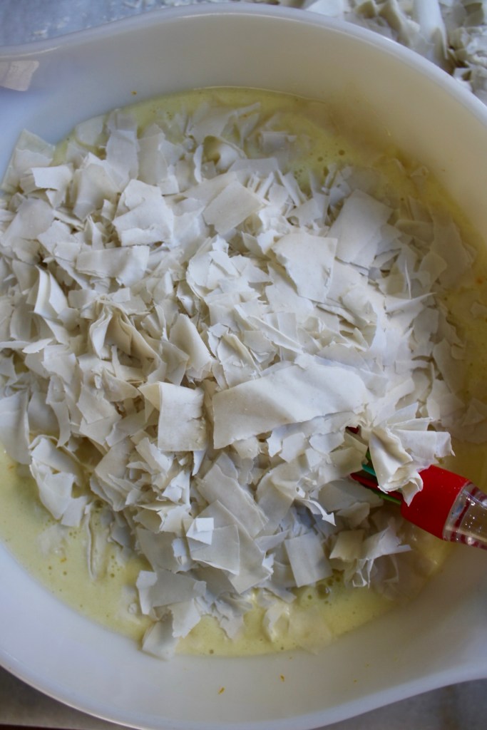 It felt auspicious that my sister sent me a recipe for a “broken phyllo” cake when I was debating what to do with all the extra crumbled phyllo dough in the freezer (left over from the cherry almond croissant loaf.) Meant to be!