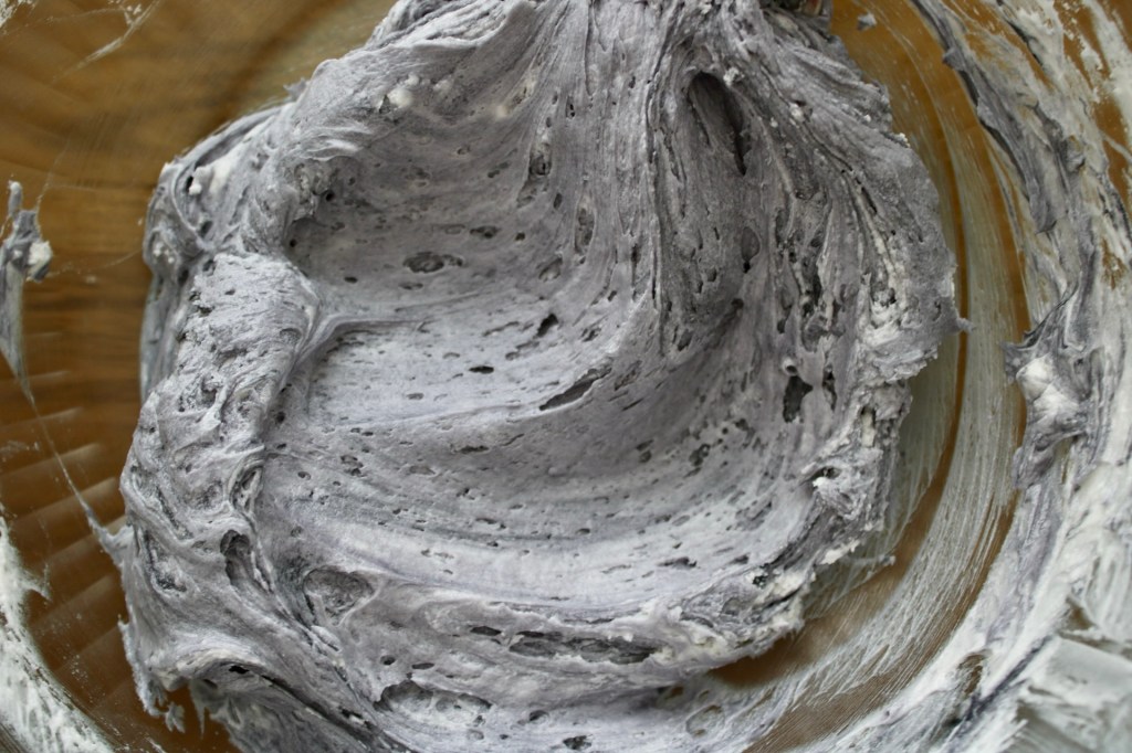 Light grey darkened to deep charcoal after immersion blending it and letting it chill in the fridge for awhile. This color would have been perfect for tombstones though! **Note to self for future Halloween bakes.