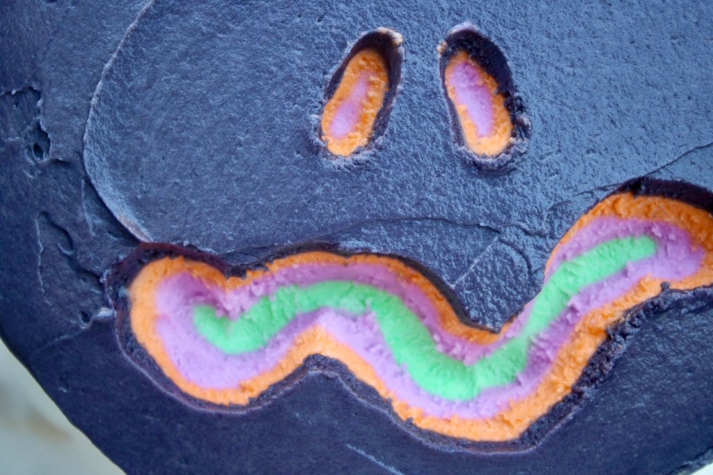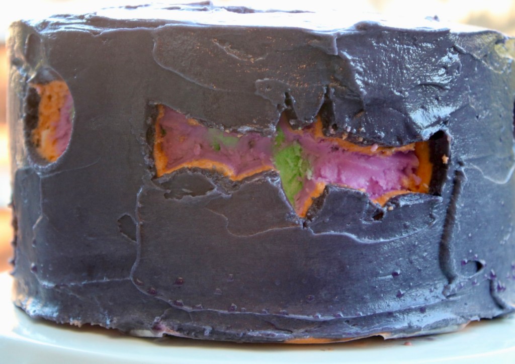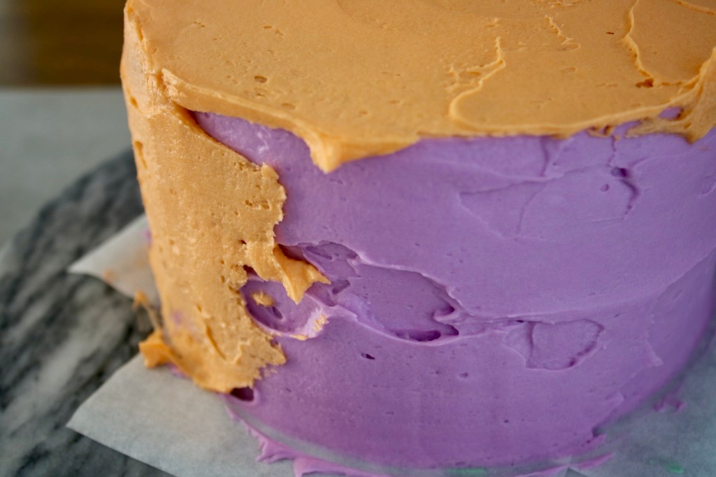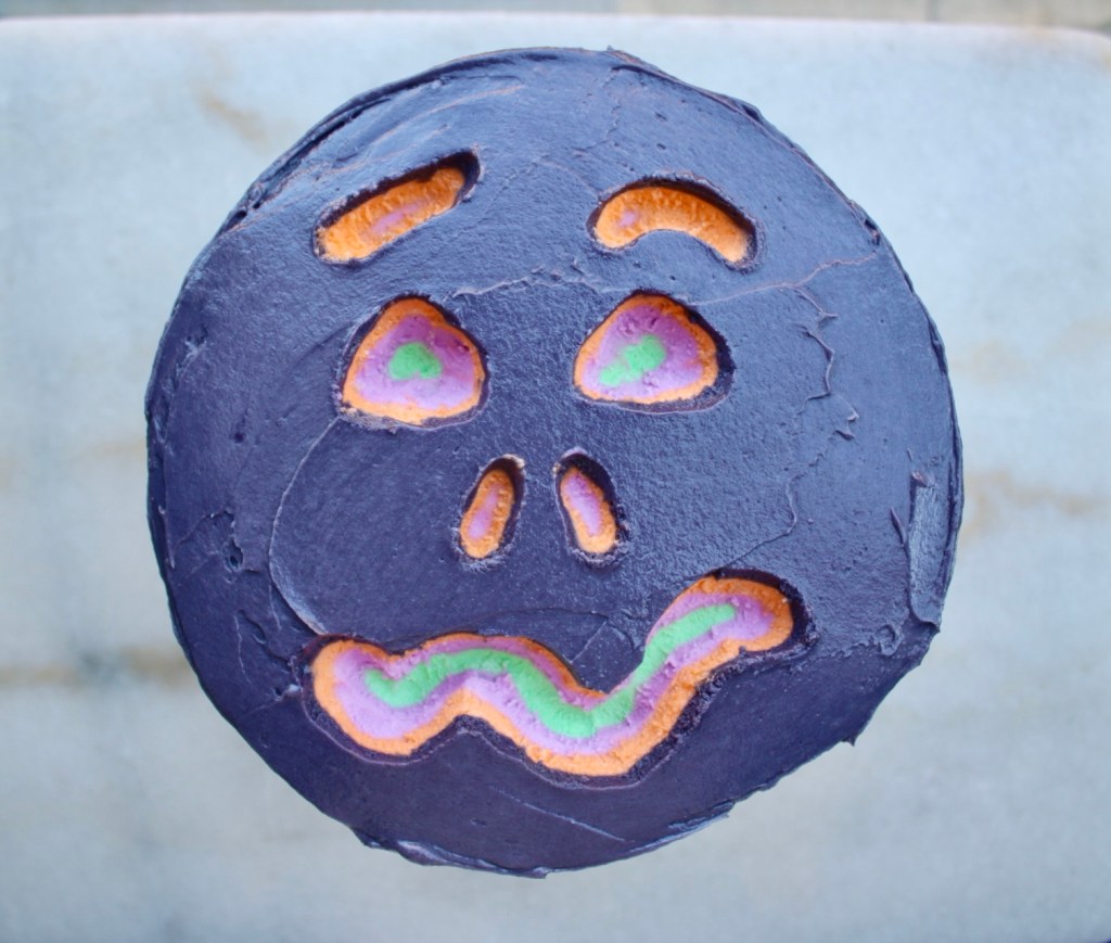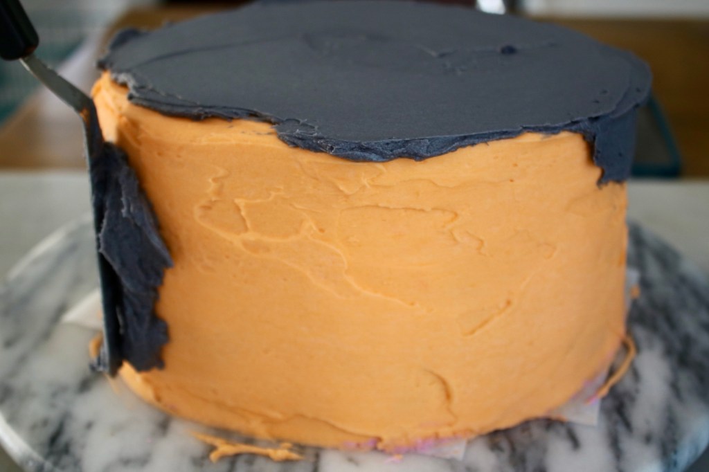 My original plan was to have the orange layer of frosting as the top so it would be as pumpkin-y as possible. But I have zero regrets – I love how the colors pop with the charcoal layer on the top!