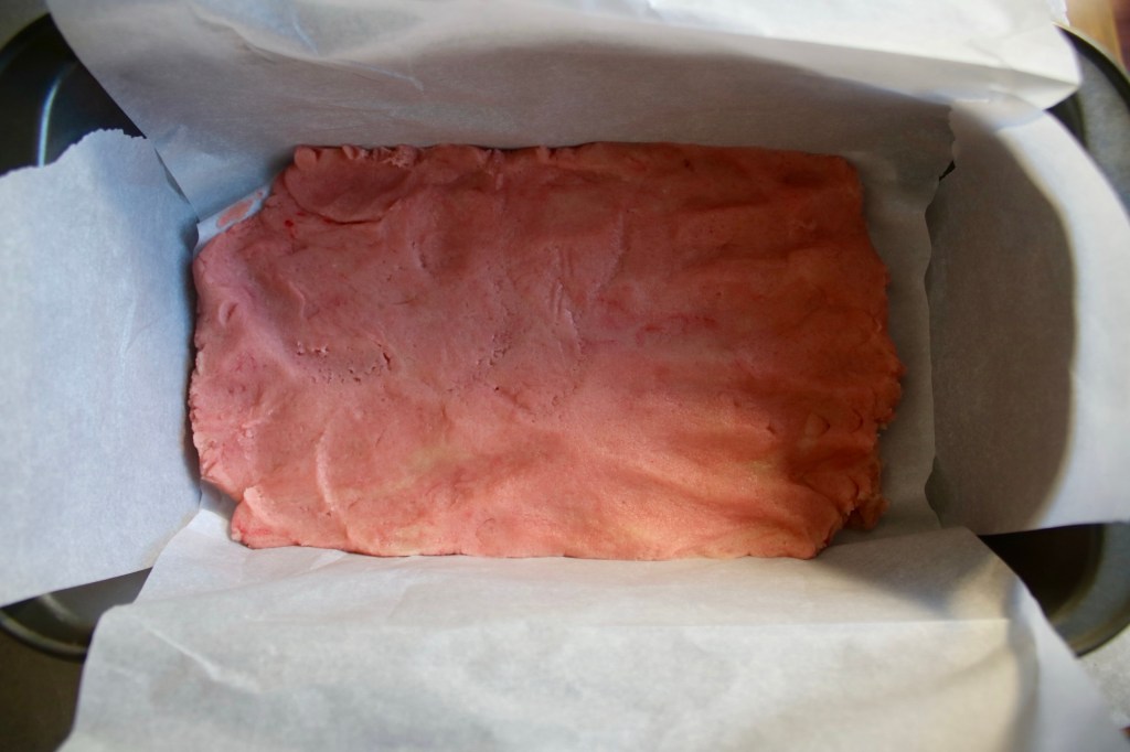 The pink dough gets a little extra flour to help offset the liquid for the flavoring. We all need a little help sometimes.