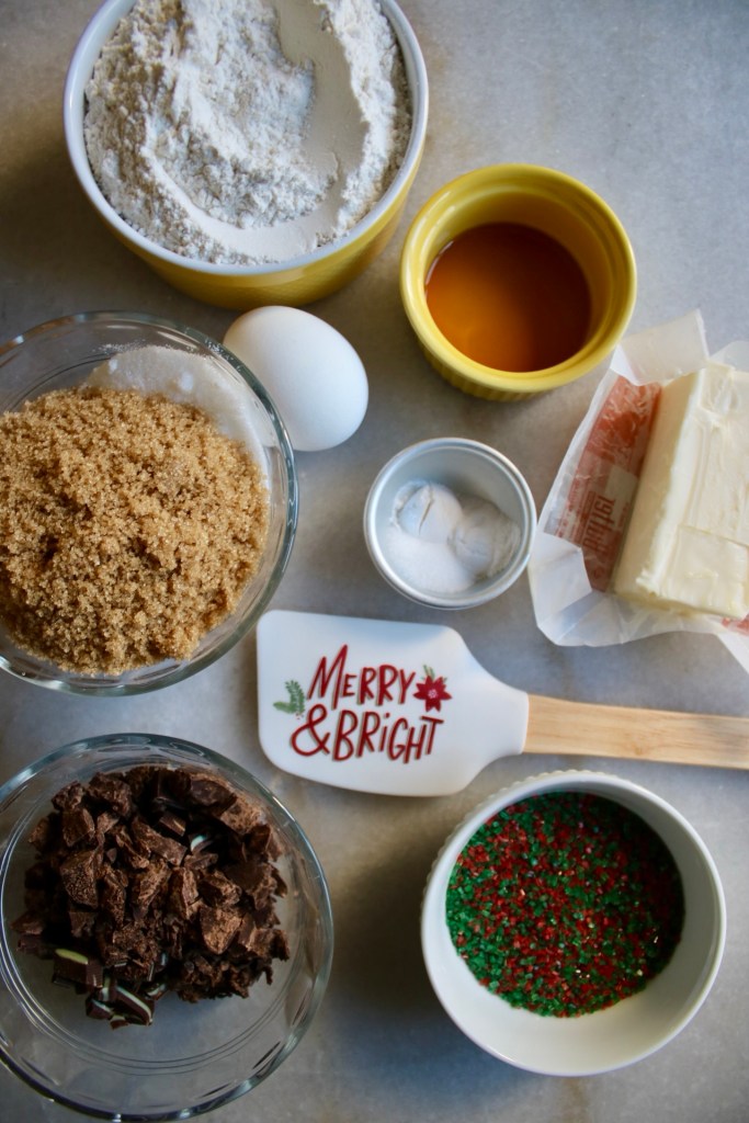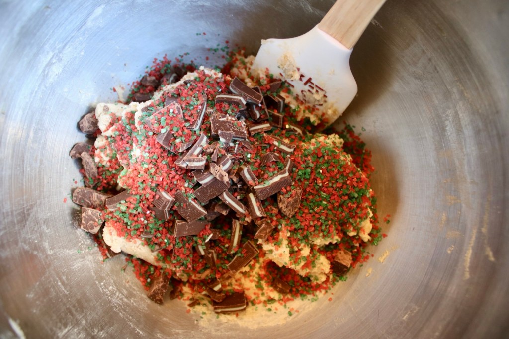 Basically a chocolate chip cookie that I waved a holiday spatula over and they transformed into festive treats. Christmas magic is alive and well (and fueled by sprinkles and Andes mints.)