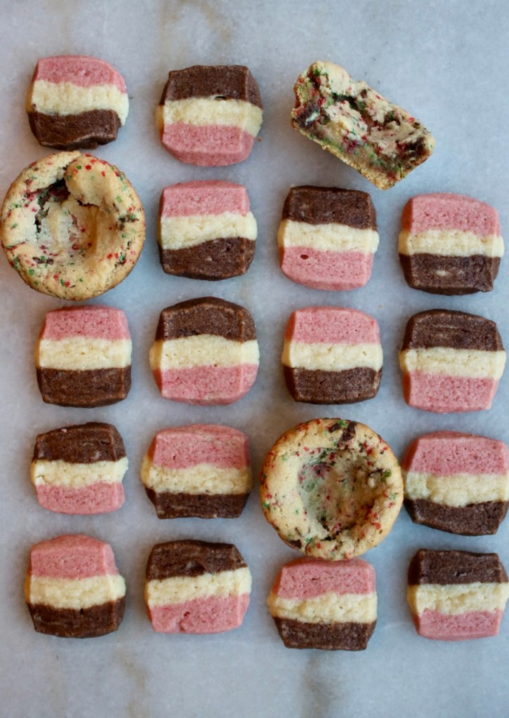 These lil guys are a one-dough-three-ways magic trick. You make a vanilla shortbread dough, and flavor one third of it with cocoa powder and melted chocolate and another third with almond extract and strawberry jam. Or if you’re me, pomegranate juice because that’s what you have on hand!