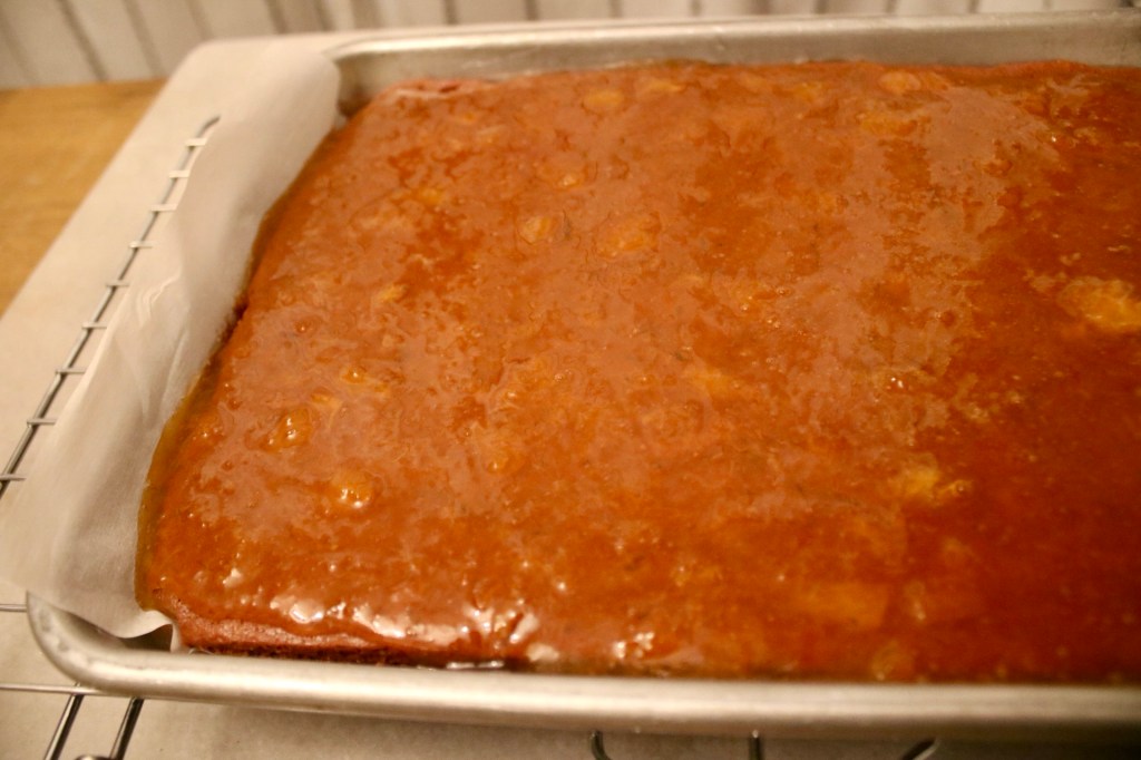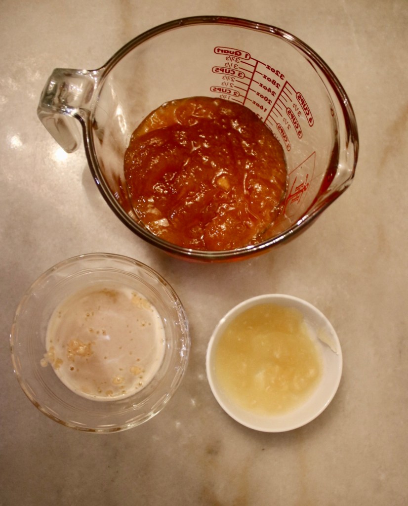 Time to get jammin’. Lemon juice, a combo of homemade apricot, peach and apricot lime jams (thanks Mom!) and gelatin to help keep it in a recognizable layer.