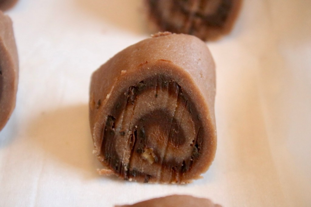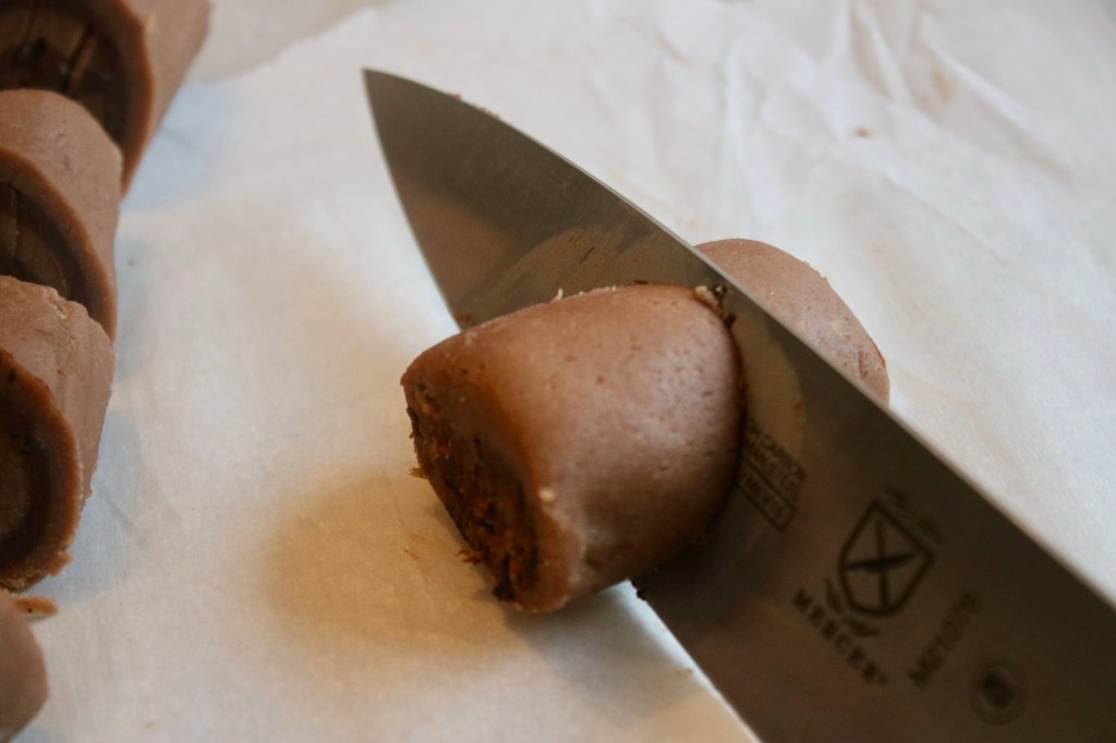 Claire’s tip about freezing the logs before slicing is a must. I thought mayyybe I could cut that corner but the first few cuts made the spiral go wonky.