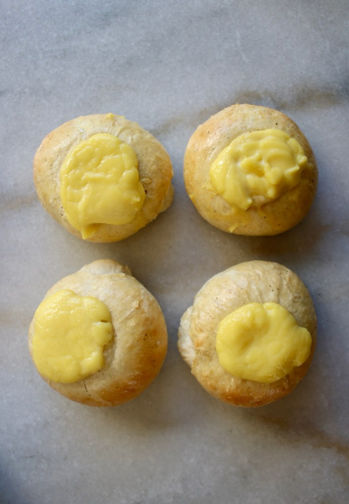 If yours decide to poof up rebelliously like mine, wait til they’re cool to move them to a rack so the custard has a chance to set. Otherwise you’ll get a sad custard waterfall.