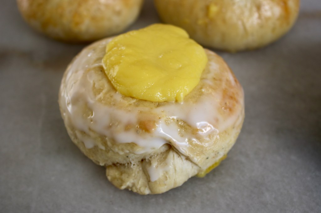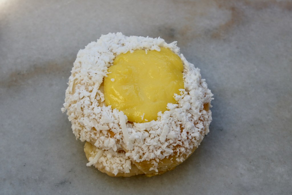 This round fellow is in the happy middle ground between a cardamom bun and a doughnut: plush gently-spiced dough, covered in a sweet icing and shredded coconut with a puddle of vanilla pastry cream in the center.