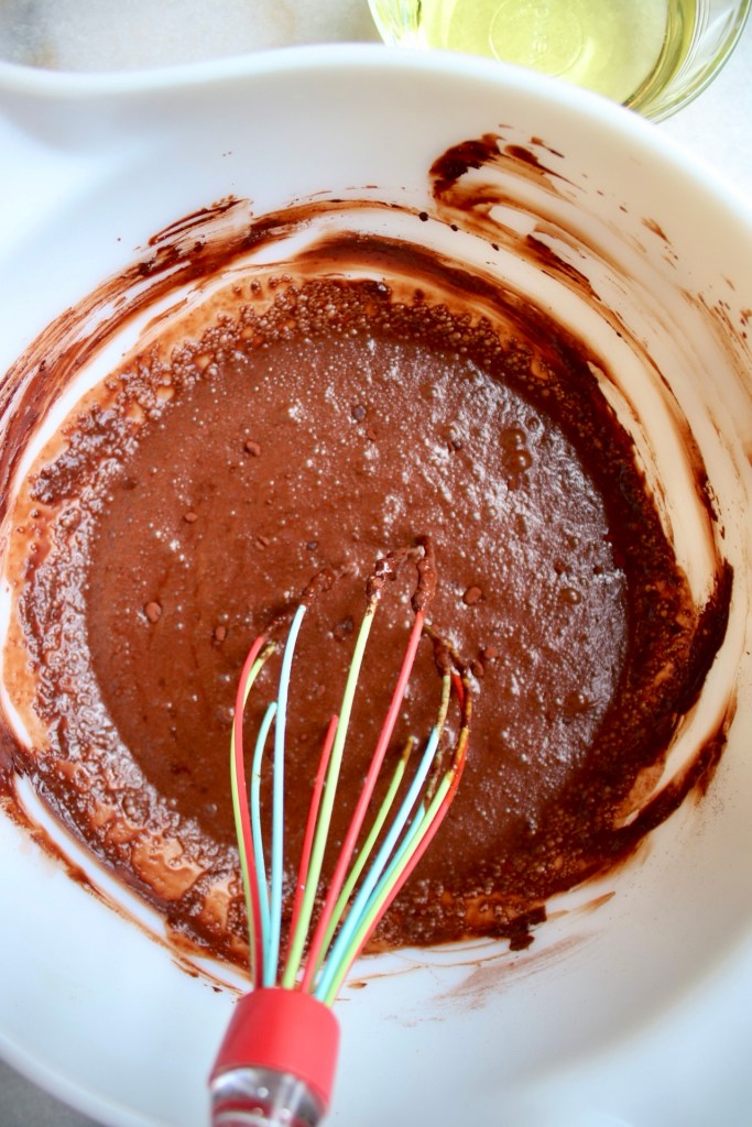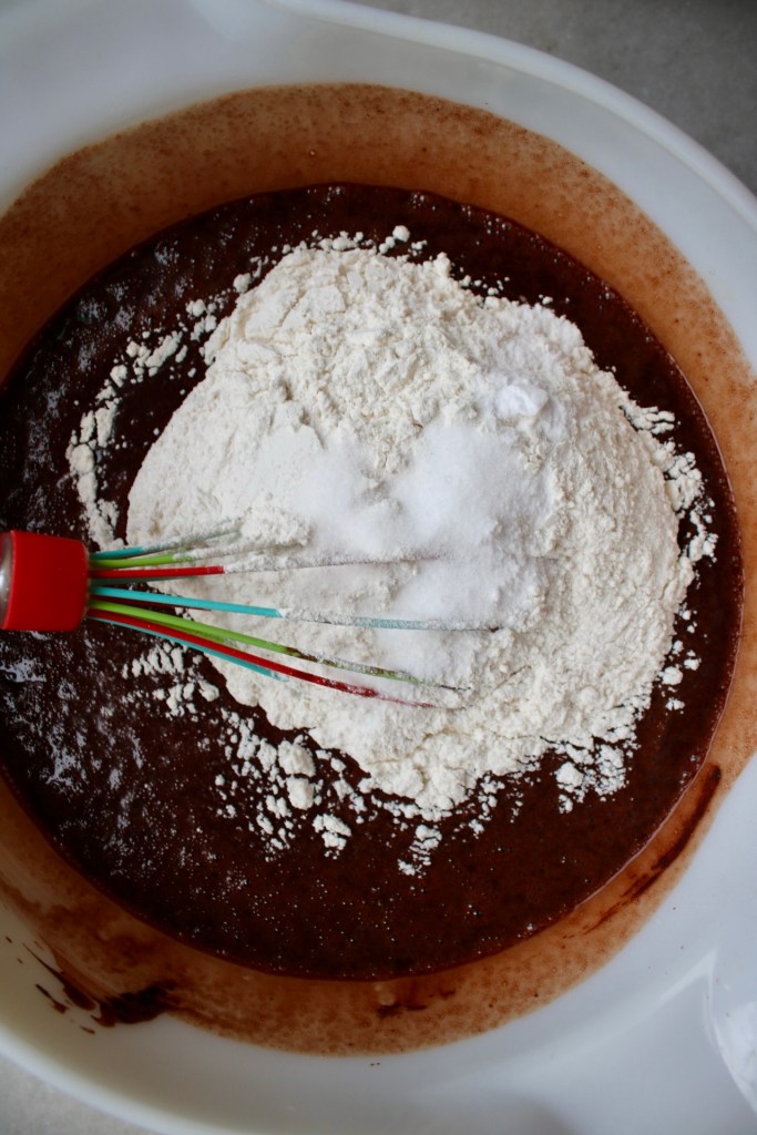 Blooming the cocoa powder with hot water. Feels extra appropriate for a flower cake!