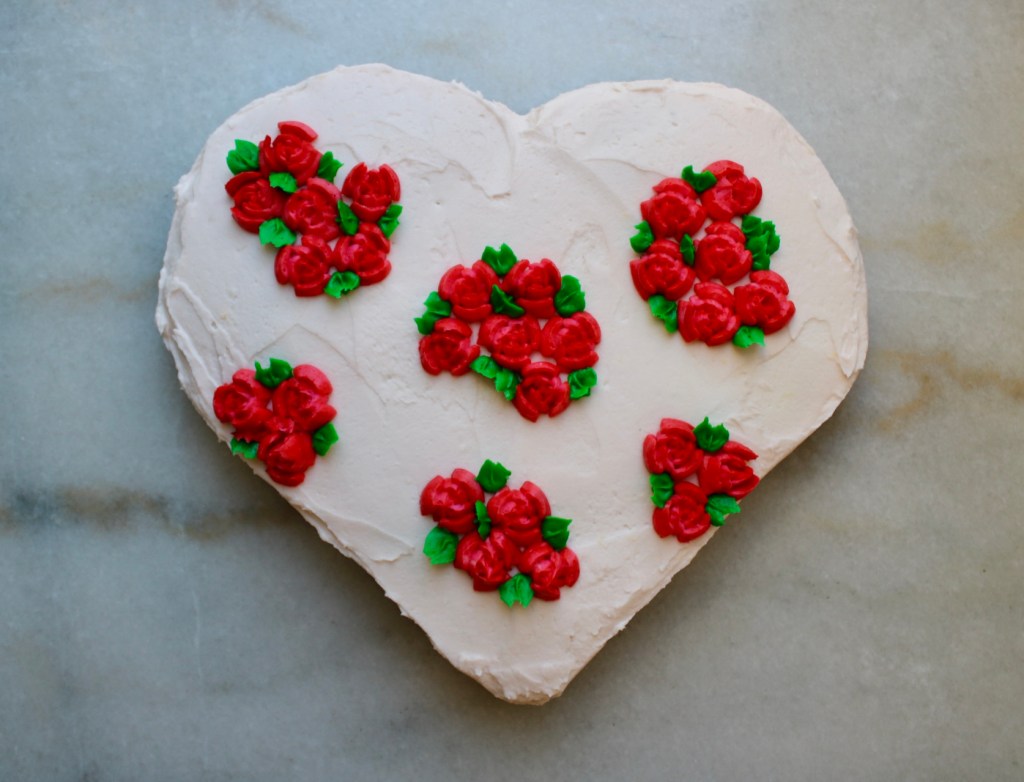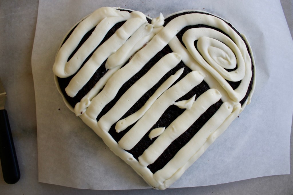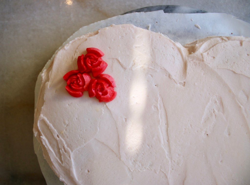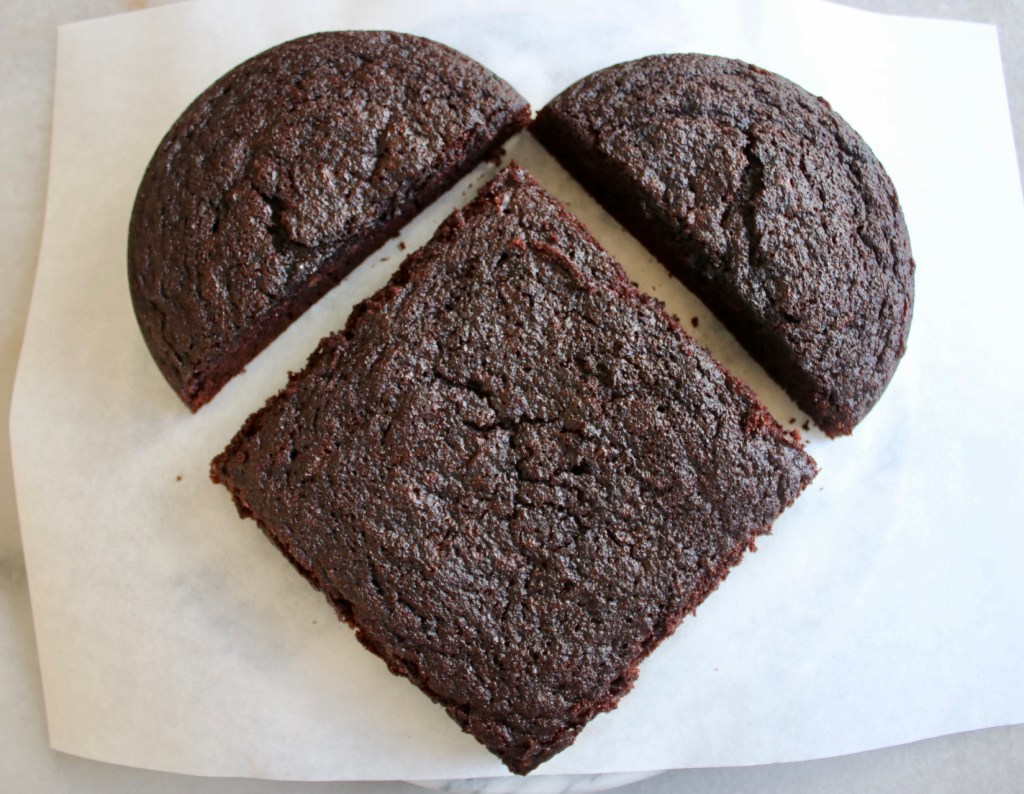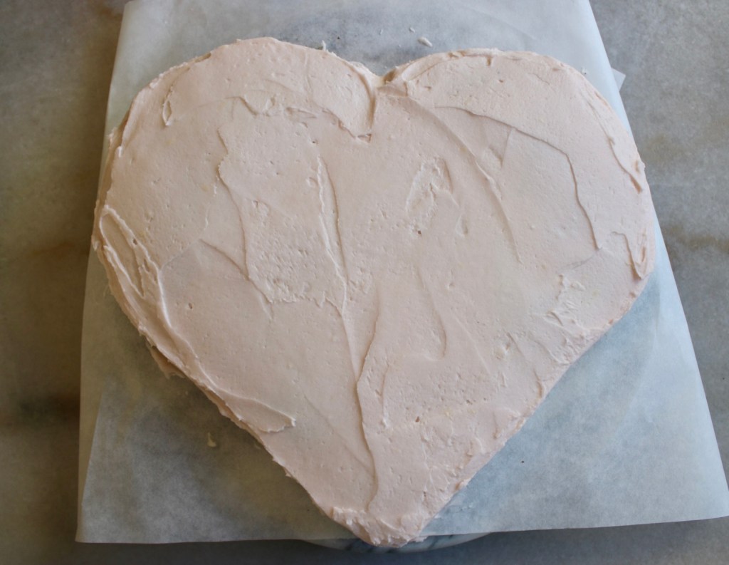 Chop the round cake in equal halves and then trim the edges of the square until they really are the exact same length as the half circles. Plop the circle halves on like Mickey Mouse ears and ta-daa you have a heart!