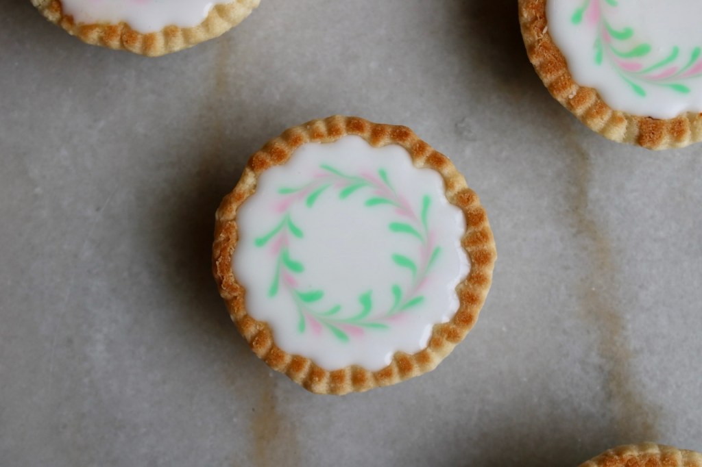 I used a quick water and sugar icing for the decoration, but a white chocolate ganache would hold the design longer (if these are going out into the world and not just directly into your mouth.)