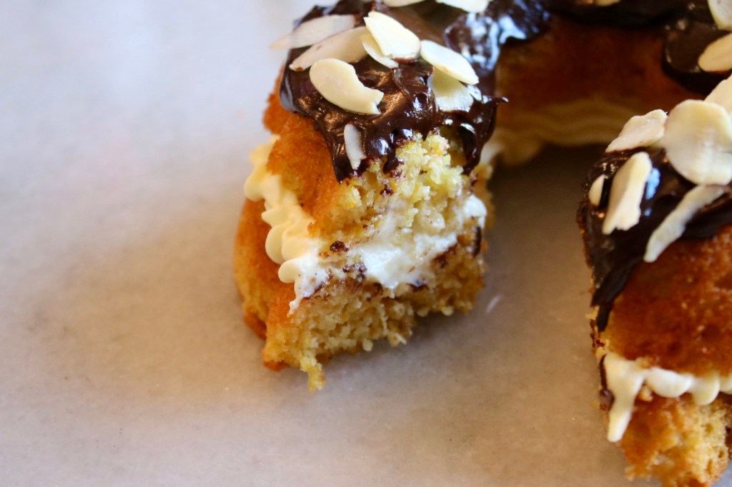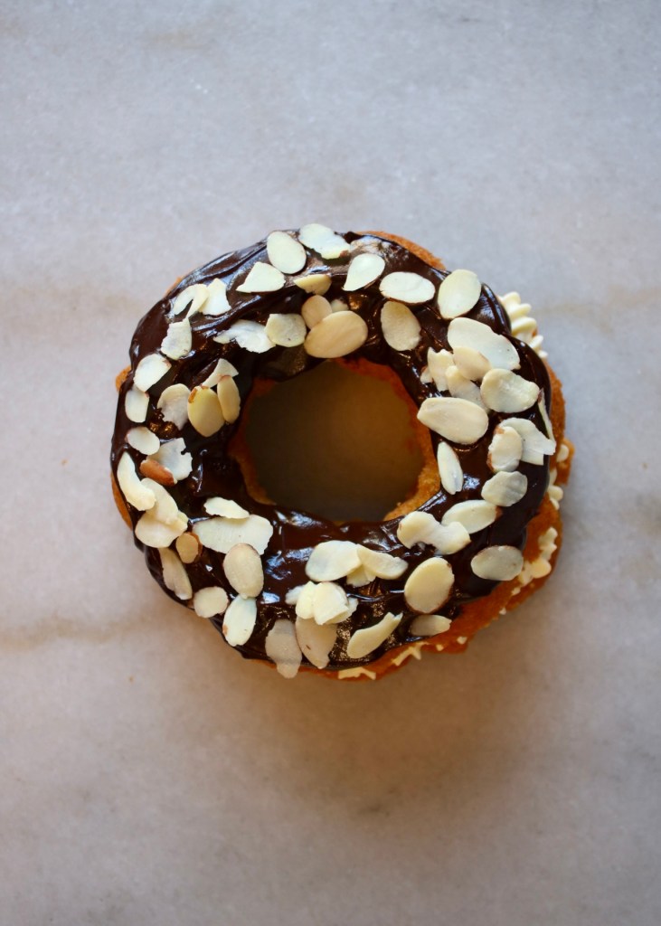 Assembly line up: dark chocolate melted with cream, vanilla pastry cream and sliced almonds. The pastry cream recipe and steps are hiding in my craquelin cream puff post here.