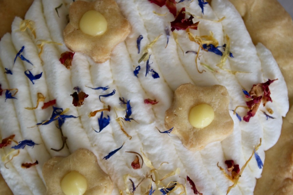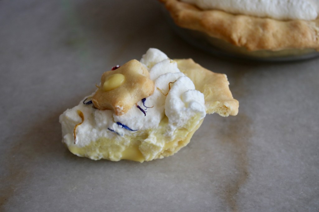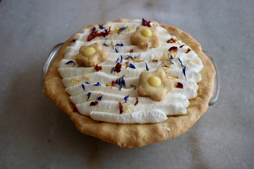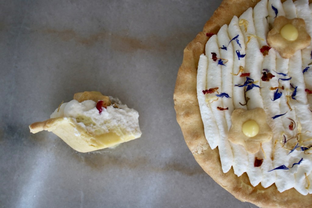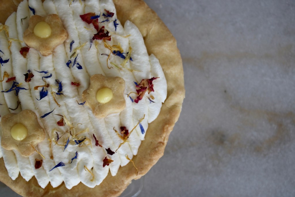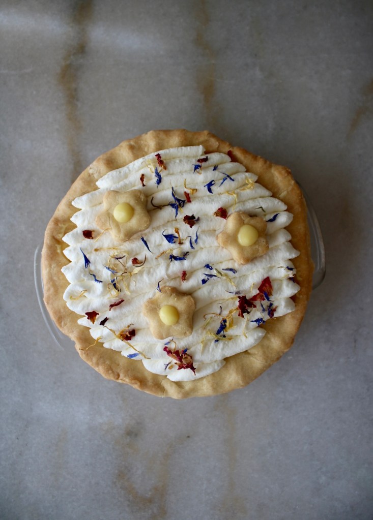 The mini pie dish strikes again! Layers of flaky crust, bright passionfruit curd, creamy coconut lime custard, topped with fluffs of chantilly cream and edible flowers.