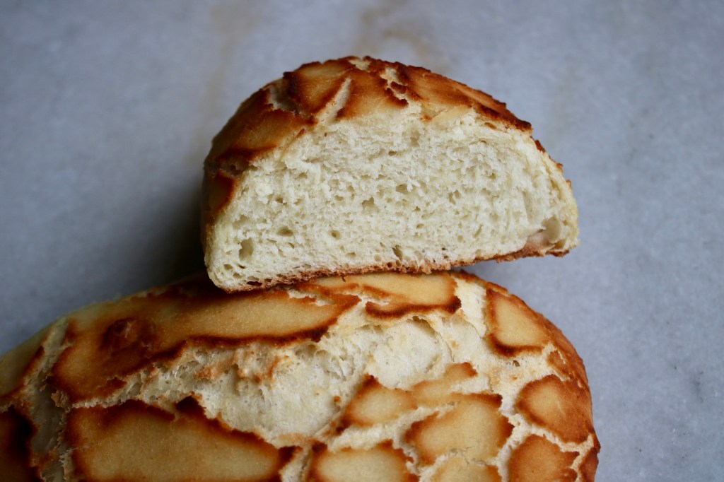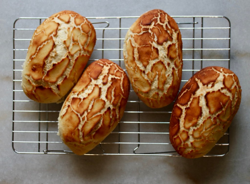 A perfect Dutch crunch has a soft roll base with a medium-thin crackly coating. The topping is essentially a savory craquelin made of a mostly rice flour, and surprisingly no cheese. (For some reason I always assumed there was cheese of some sort involved, but joke’s on me!)