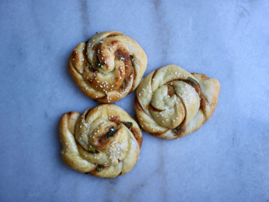 I got inspired by Edd Kimber’s (theboywhobakes on Instagram) gochujang garlic buns – a swirled savory bun? Yes please! I swapped out the gochujang in the compound butter for a mix of red and white miso pastes and threw in some hot honey to give a tiny kick.