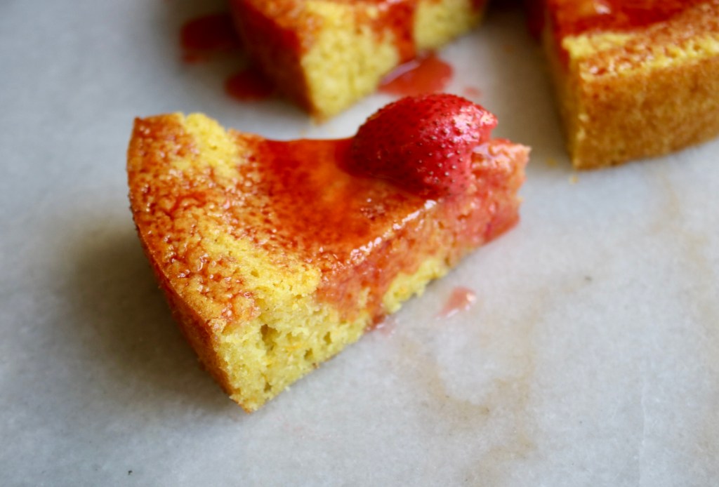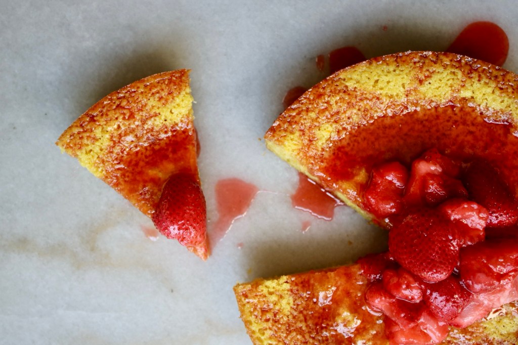 An olive oil cake imbued with prosecco and orange zest is a joy on its own, but why not gild the lily with strawberries in an Aperol sugar syrup?