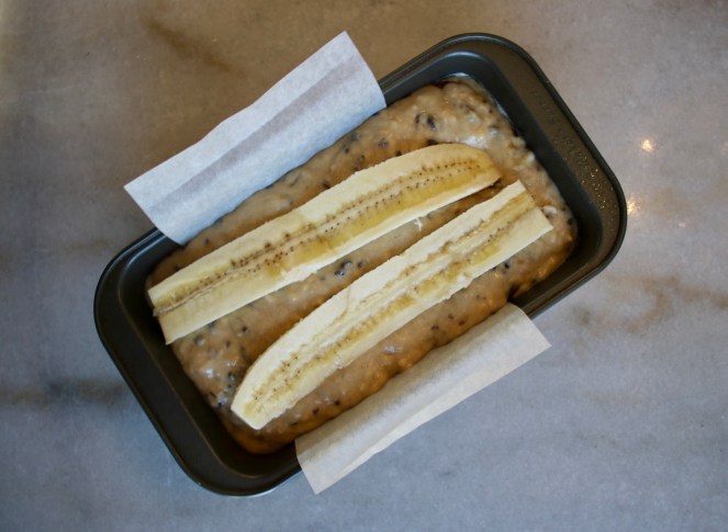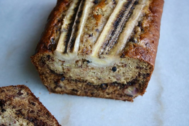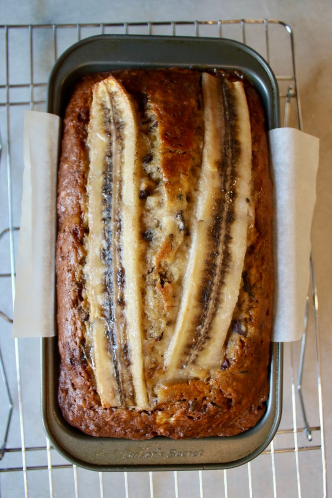 I’ve always wanted to make a loaf of fancy banana bread with a split banana baked into the top but this is the first time I’ve ever managed it. Despite how simple it sounds, it required something that I rarely have on hand: fresh ripe bananas. I’m that person who reaches for the almost over-ripe bananas at the store and then immediately adds them to my freezer banana stash when I get home. Someone’s gotta balance out all the green banana fans!