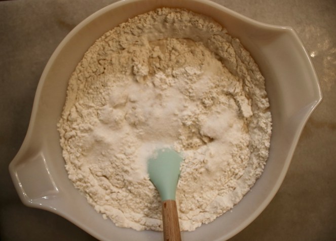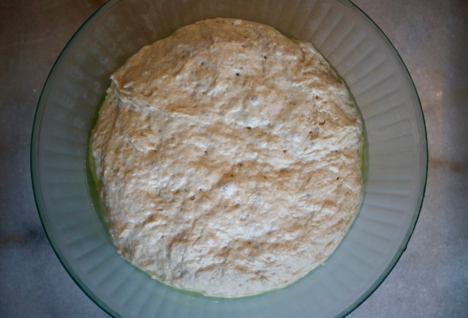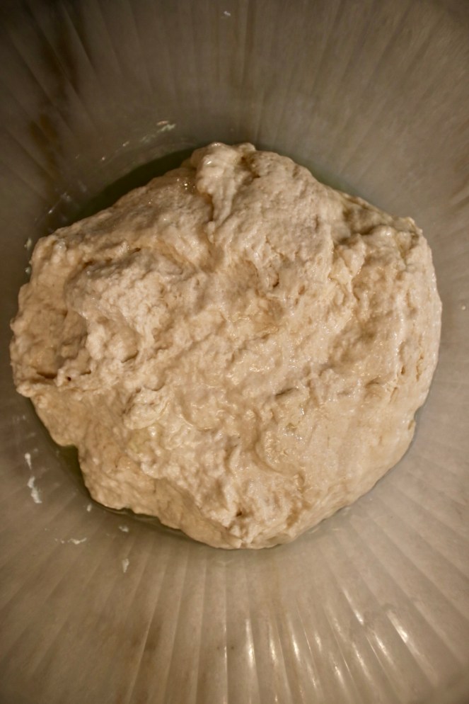 This recipe calls for dough folds (just as silly as it sounds: you grab opposite ends of the dough in the bowl, stretch them up and fold them over each other, spin the bowl 90 degrees and repeat a few times) in place of kneading, so the spatula got center stage instead of the dough hook.