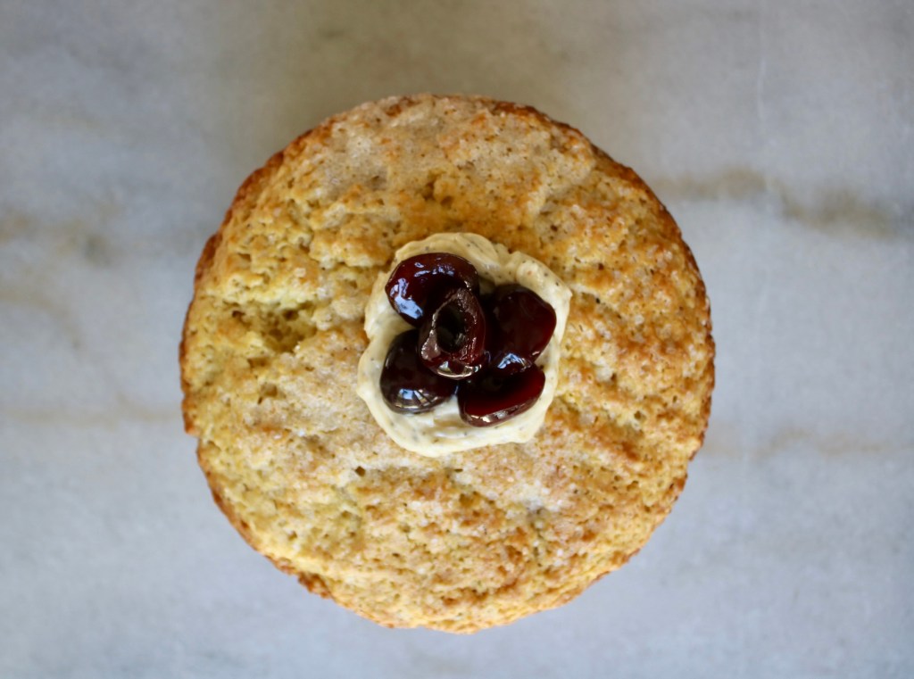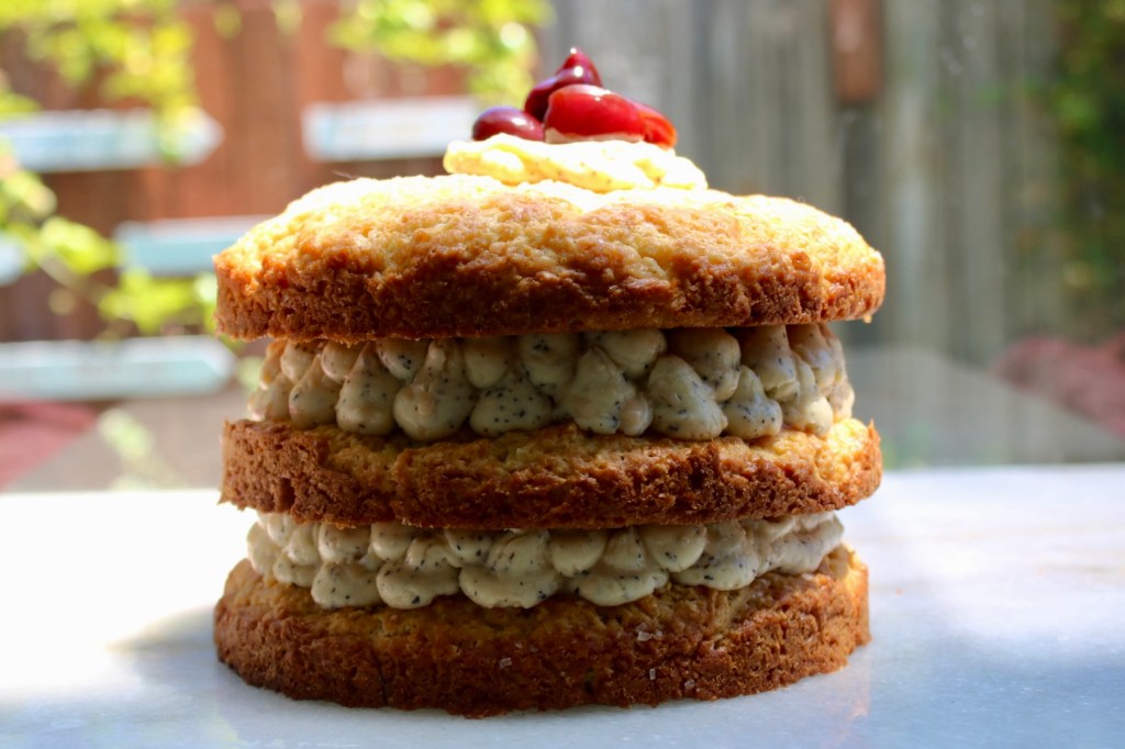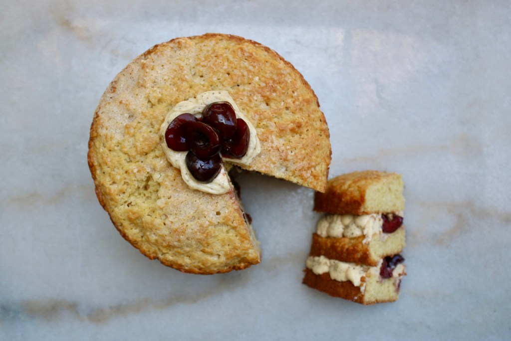 More delightful recipe inspiration from the Baking Nation newspaper! Instead of individual shortcakes, you bake the dough in cake tins and stack them up into a layer cake. I swapped out cherries for the classic strawberries and ended up with an Earl Grey mascarpone buttercream instead of whipped cream.