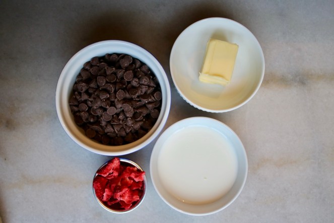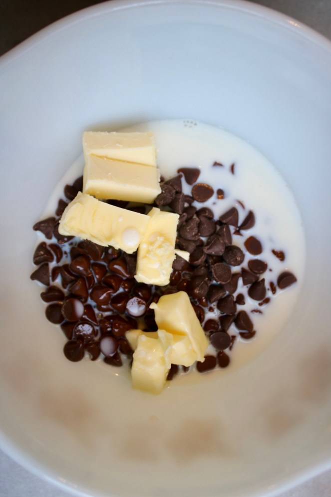 How do you normally make ganache? My brain automatically jumps to heavy cream, but apparently whole milk and butter work just as well! It can be a little less stable than the cream version, but with the butter upping the fat content, it has a pretty similar texture.