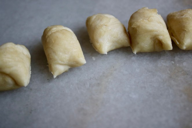 Then you just chop the cylinder into little pillows to roll out into dumpling wrappers. Voila!