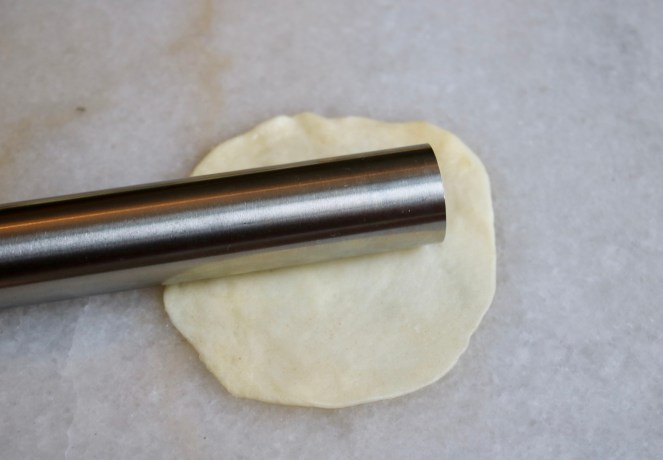 My regular rolling pin dwarfed the tiny dough pillows so I grabbed a cannoli form instead. Get you a weird metal tube that can do it all.