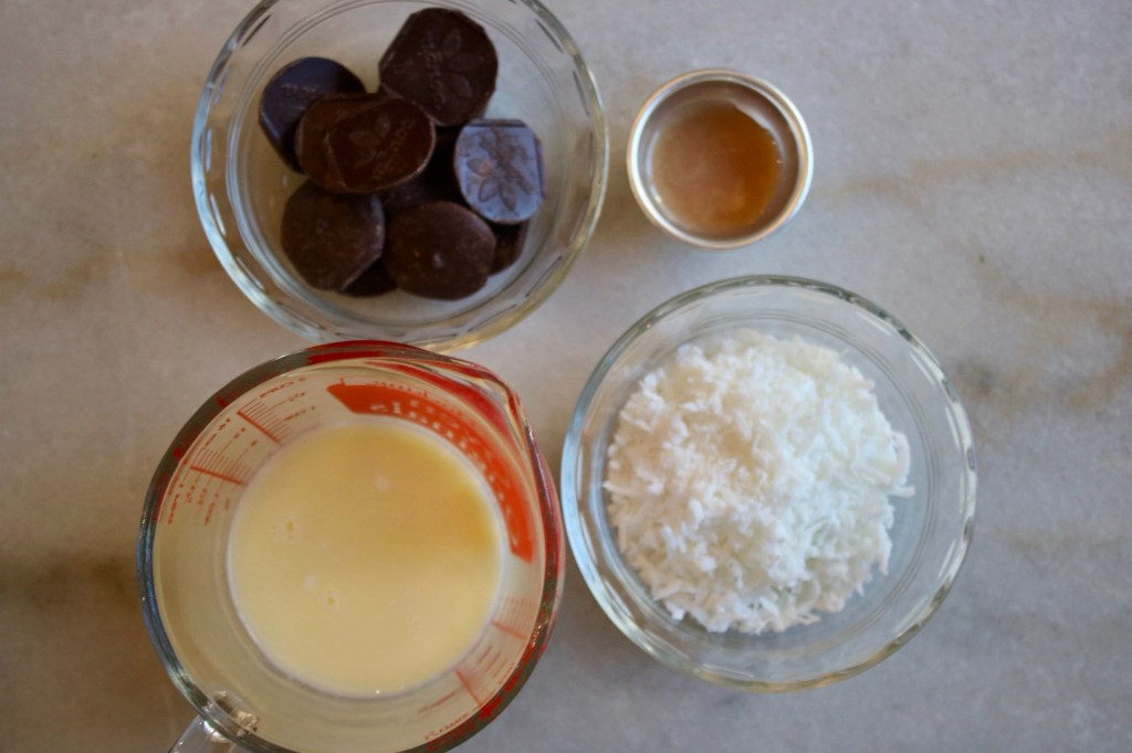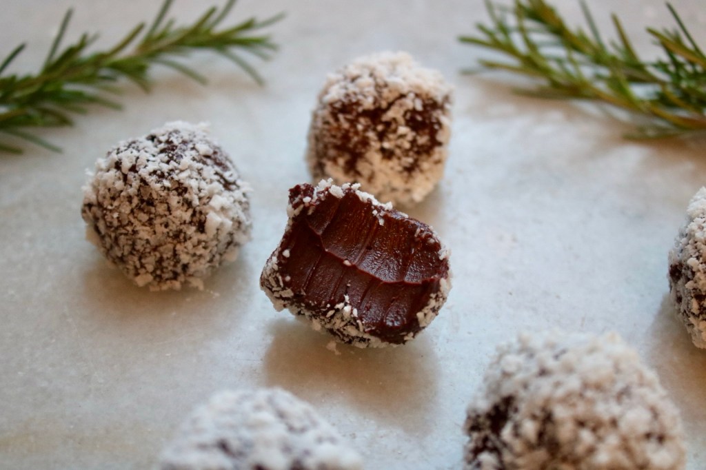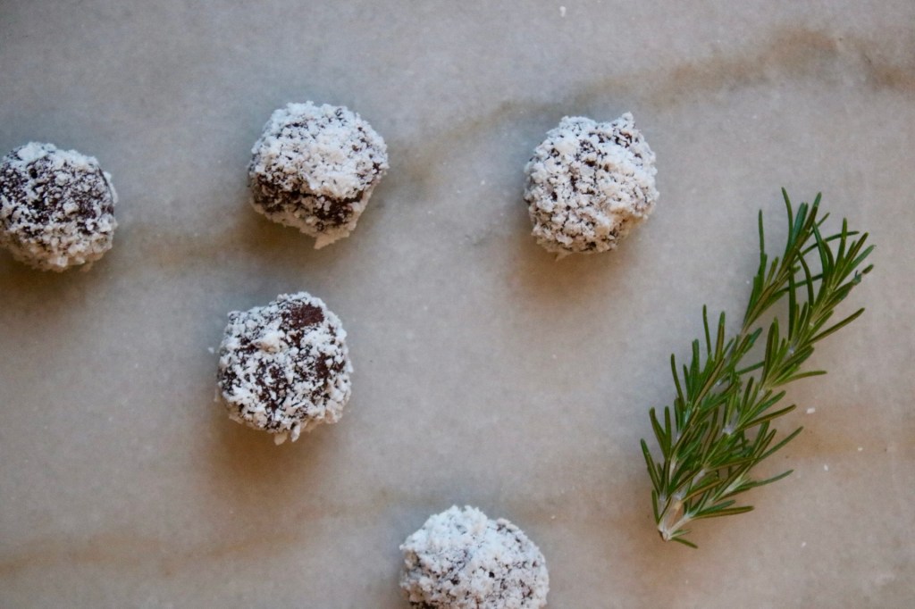Not only is it cute, but rolling them in ground coconut snow keeps the chocolate from getting everywhere. Though eating them in one bite solves that problem anyway!