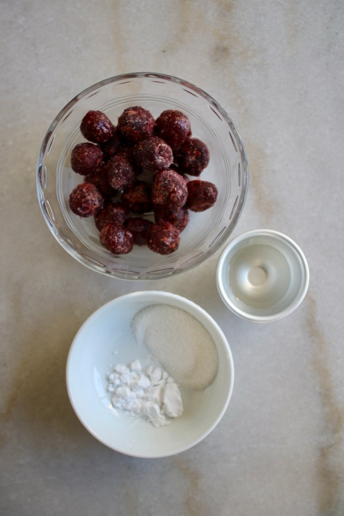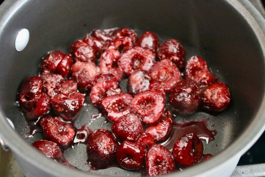 A bold and silly baker wears a white sweater while making cherry jam. Happy to report no splatter stains!