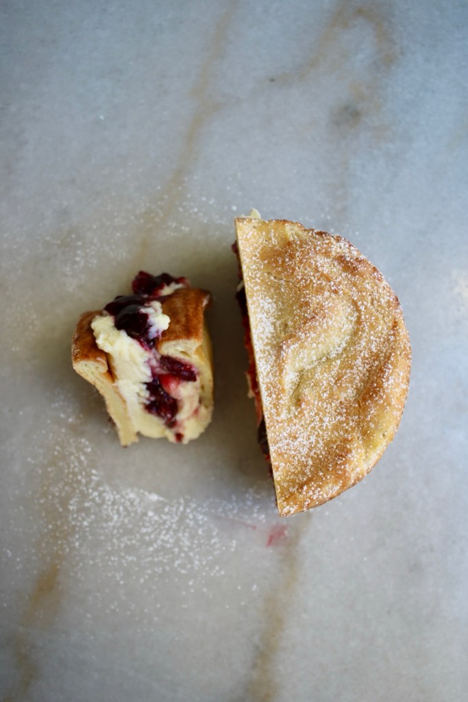 If an eclair and a danish had a fancy dessert baby, you’d get a cherry karpatka. Rich pastry cream mixed with mascarpone for stability and swirled with fresh cherry jam, sandwiched between two layers of choux pastry.