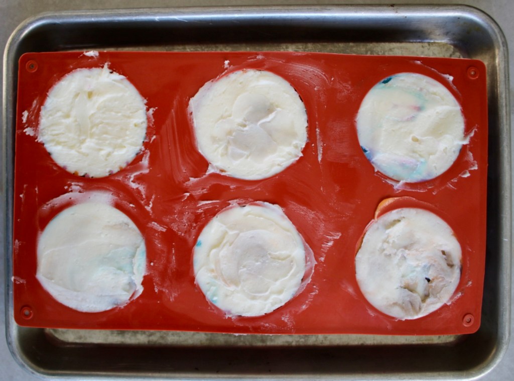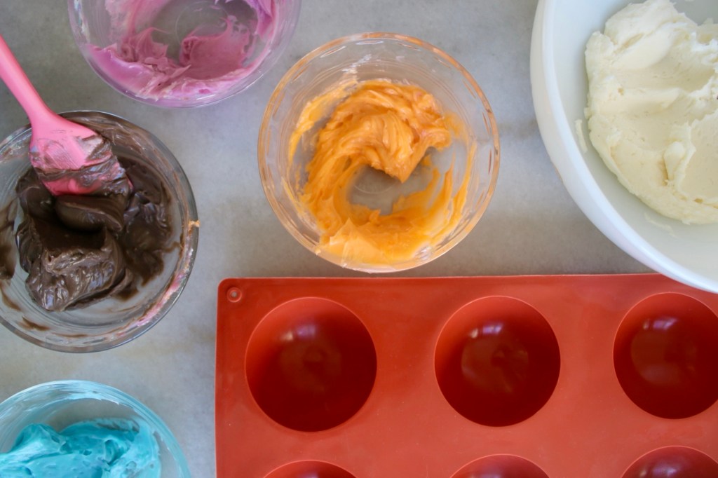 Working backwards, prepping the frosting first so it can set in the molds. Luckily the buttercream colors in my freezer stash actually looked nice together!