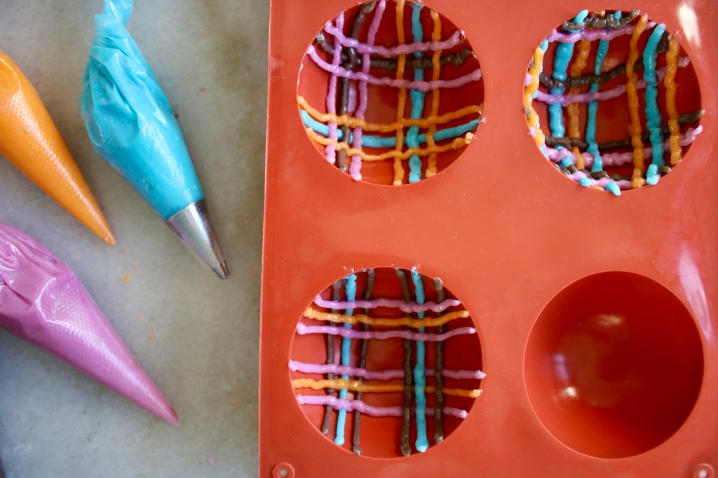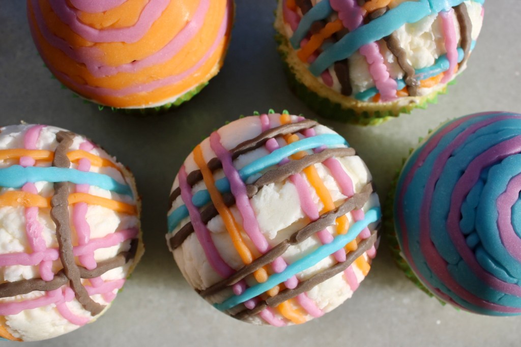 While I’m not normally a huge fan of massive amounts of frosting on cupcakes, I had to make an exception for this technique. You pipe a design into a silicone mold and freeze it to hold its shape, then fill the gaps with a base color of frosting.