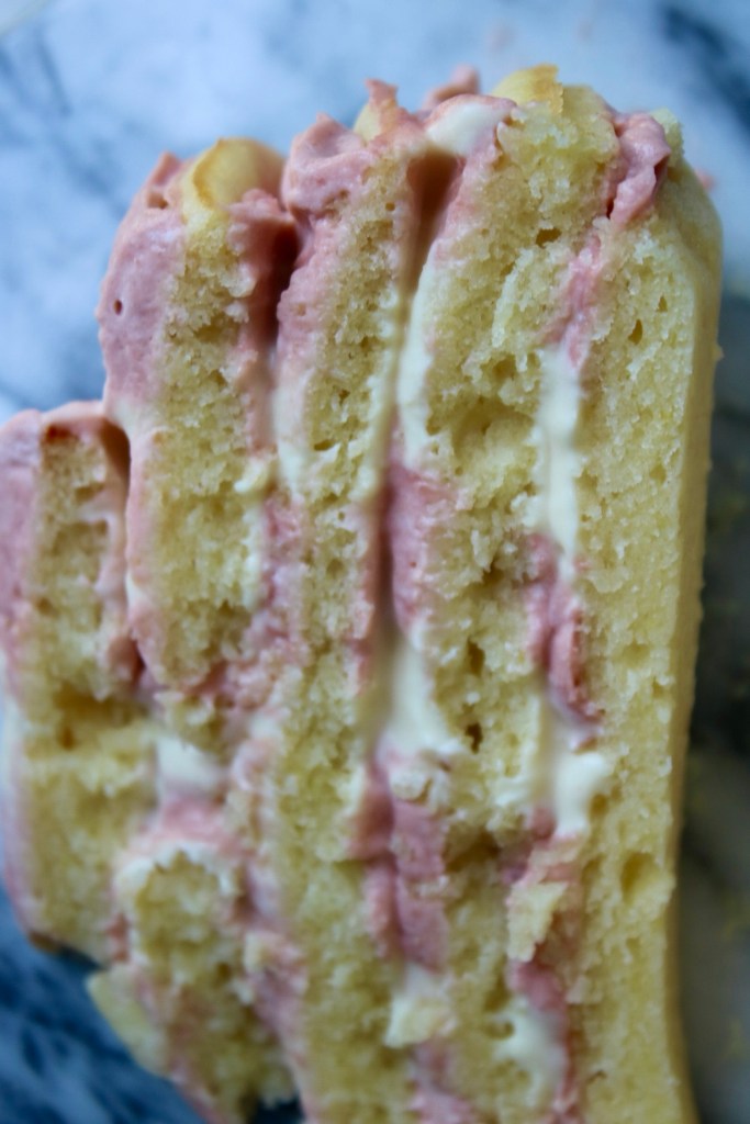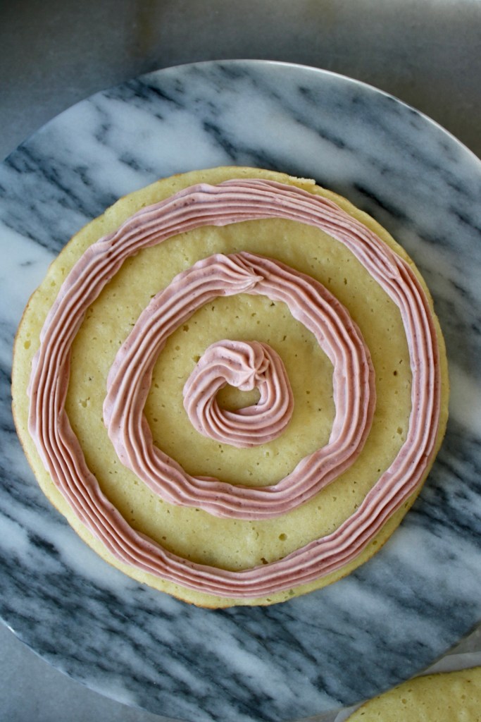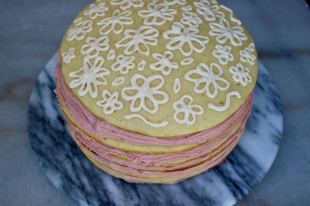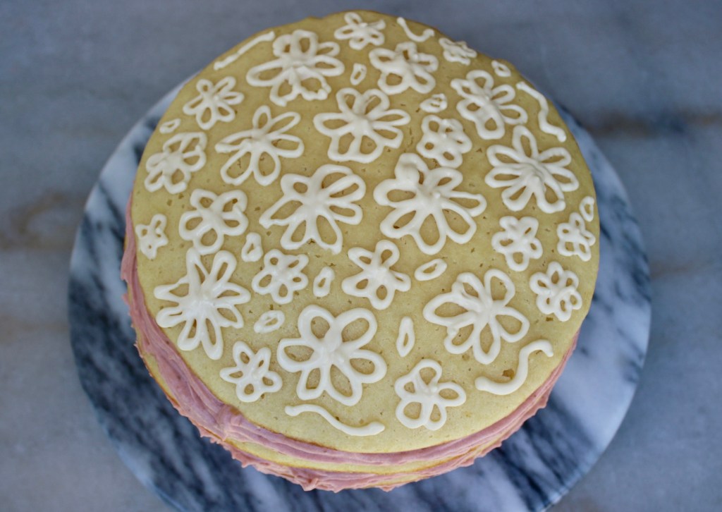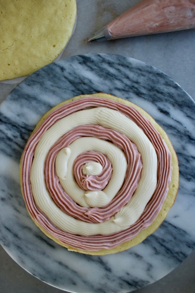 The idea is that when you slice into the cake, you’ll get a cute color block design. Even if not, piping it was fun!