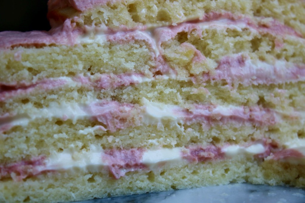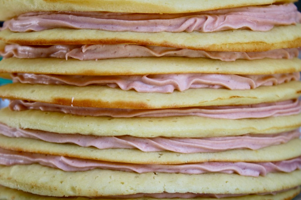 Eight thin layers of buttermilk cake, sandwiching swirls of caramelized white chocolate ganache and strawberry creme diplomat. She was a towering beauty for all of 5 minutes before swan-diving to the floor. I managed to scoop up all the bits that hadn’t touched the floor into a bowl and it tasted divine. The flavor combo slaps, if I do say so myself.