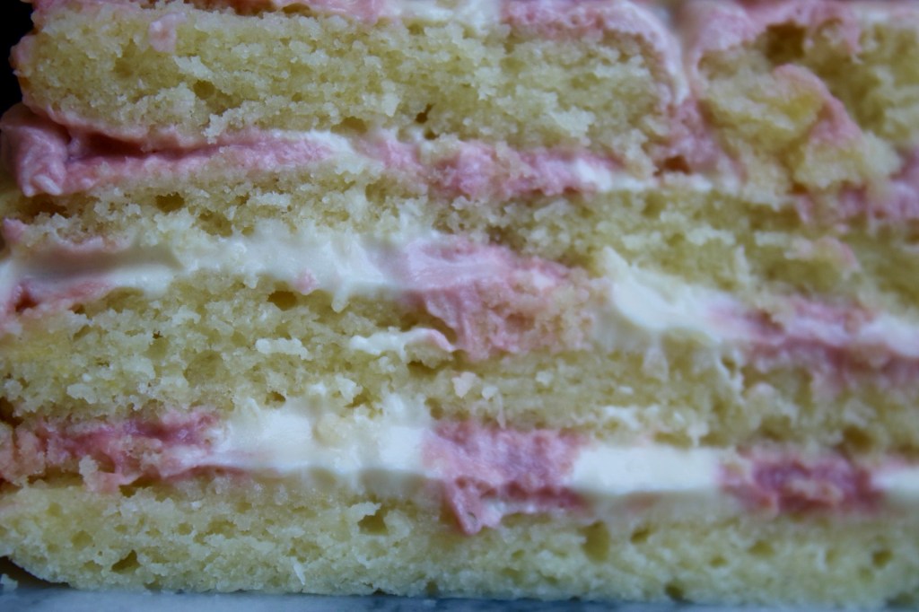 Next time (will there be a next time? Torture by repeated cake failure) I’ll need to use a very sturdy buttercream piped along the edges to keep the looser fillings in place and give the cake layers something to hold on to.