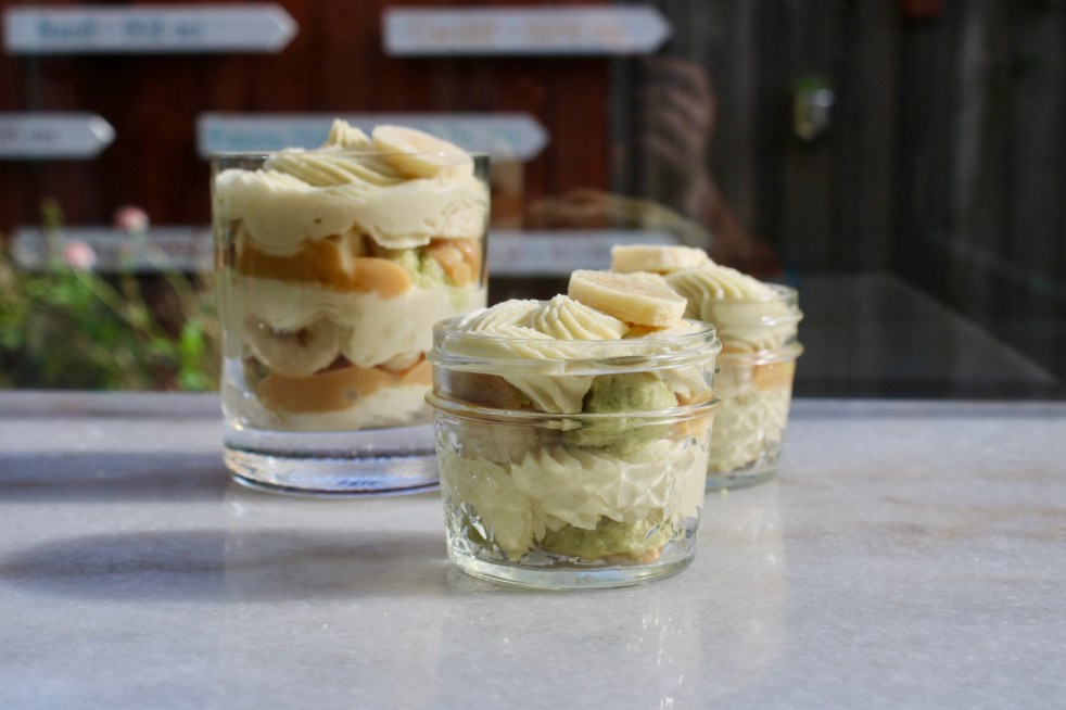 Rich coconut pastry cream layered with banana slices, miso caramel and pandan cookies. # 328: Coconut Miso Banana Pudding