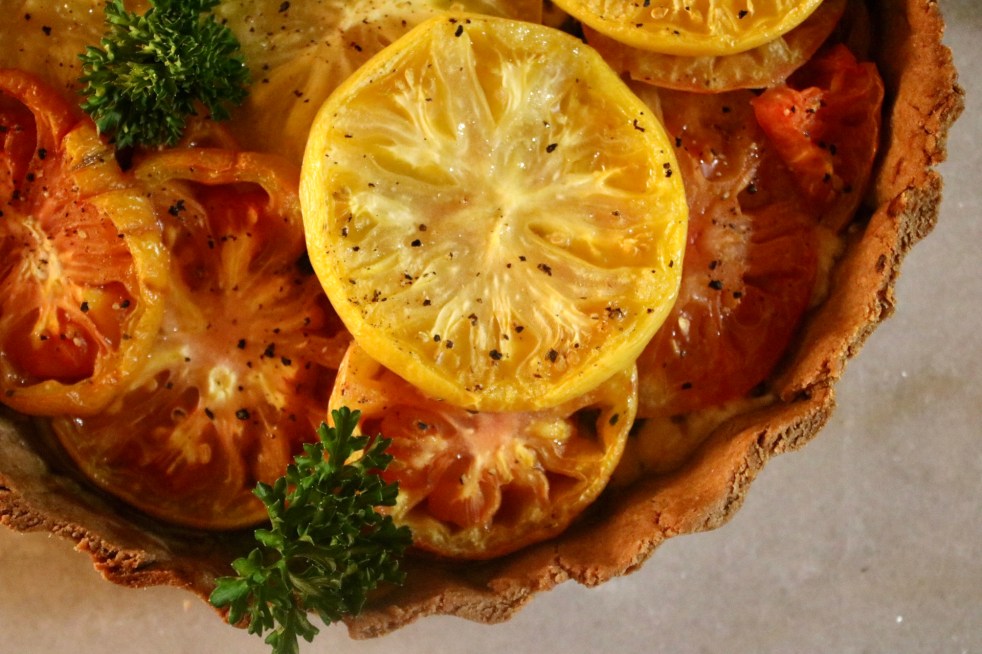 A summery rainbow of tomatoes in a crisp crust. # 227: Heirloom Tomato Tart
