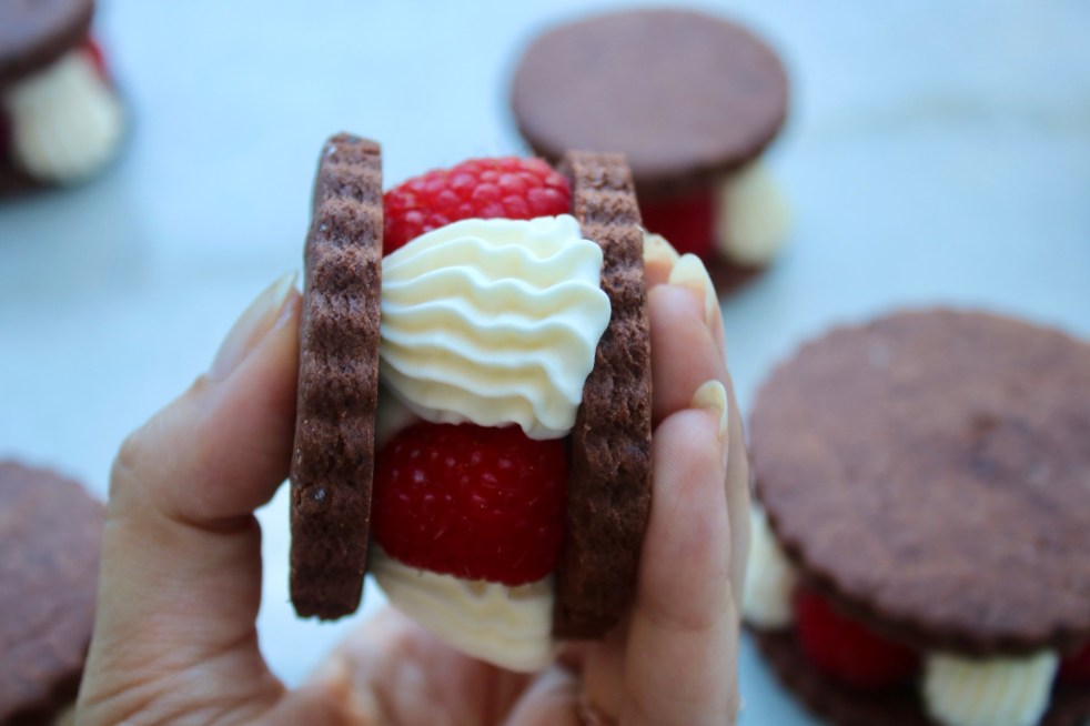When life gives you extra mascarpone whipped cream, make chocolate raspberry sammies. That’s how the saying goes, right? # 354: Raspberry Sandwich Cookies