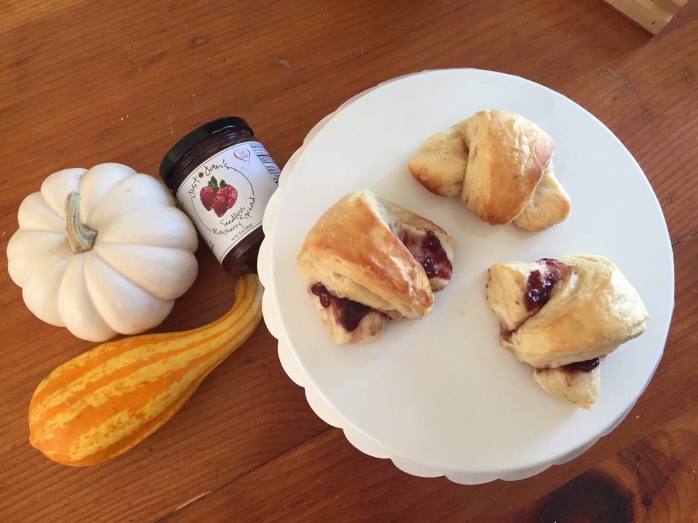 Cocoa swirls layered into buttery pastry with a bright pop of raspberry jam inside. # 285: Striped Viennoiserie