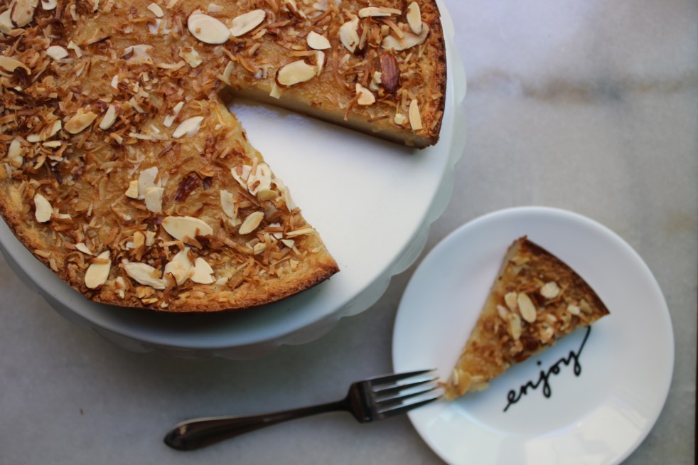Ooey-gooey slices topped with crispy coconut and sliced almonds. I dare you to eat just one piece! # 159: Coconut Almond Mochi Cake